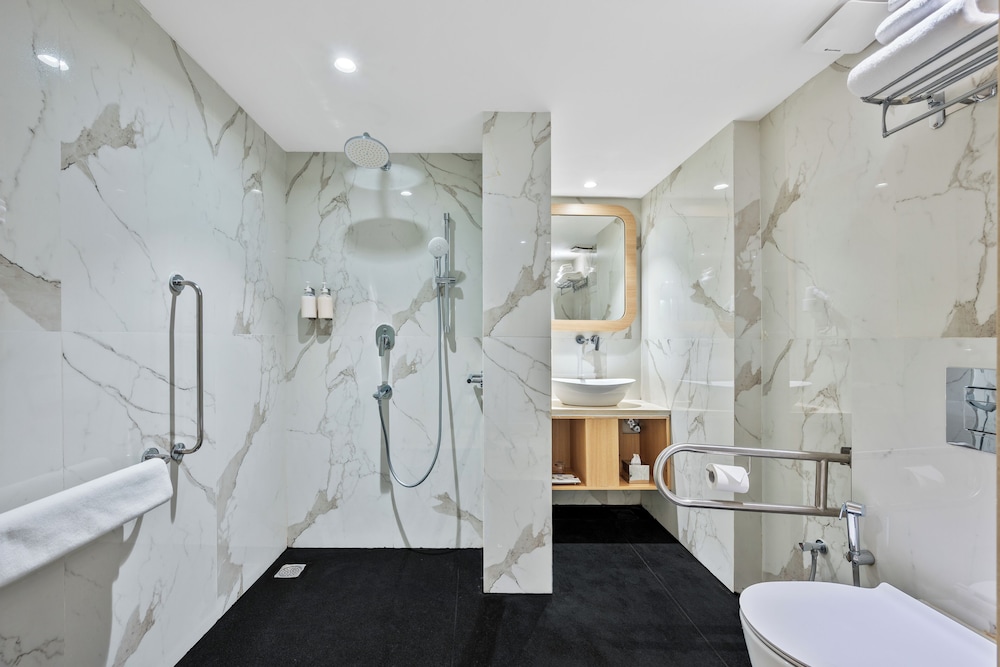 Hotel Manorama Vijayawada liegt im Herzen von Vijayawãda, 5 Minuten Fahrt entfernt von: Krishna River und Gandhi Park. Dieses Hotel ist 2,4 km von Indira-Gandhi-Stadion und 2,9 km von Bhavani Island entfernt. Fühl dich in einem der 60 klimatisierten Zimmer mit LCD-Fernseher wie zu Hause. Dein Memory-Foam Bett bietet Daunenbettdecken und hochwertige Bettwaren. Ein WLAN-Internetzugang (kostenlos) ist ebenso verfügbar wie Digitalempfang. Es sind eigene Badezimmer mit Duschen vorhanden, die über Haartrockner und Hausschuhe verfügen. Entfernungen werden bis auf 0,1 Kilometer gerundet.